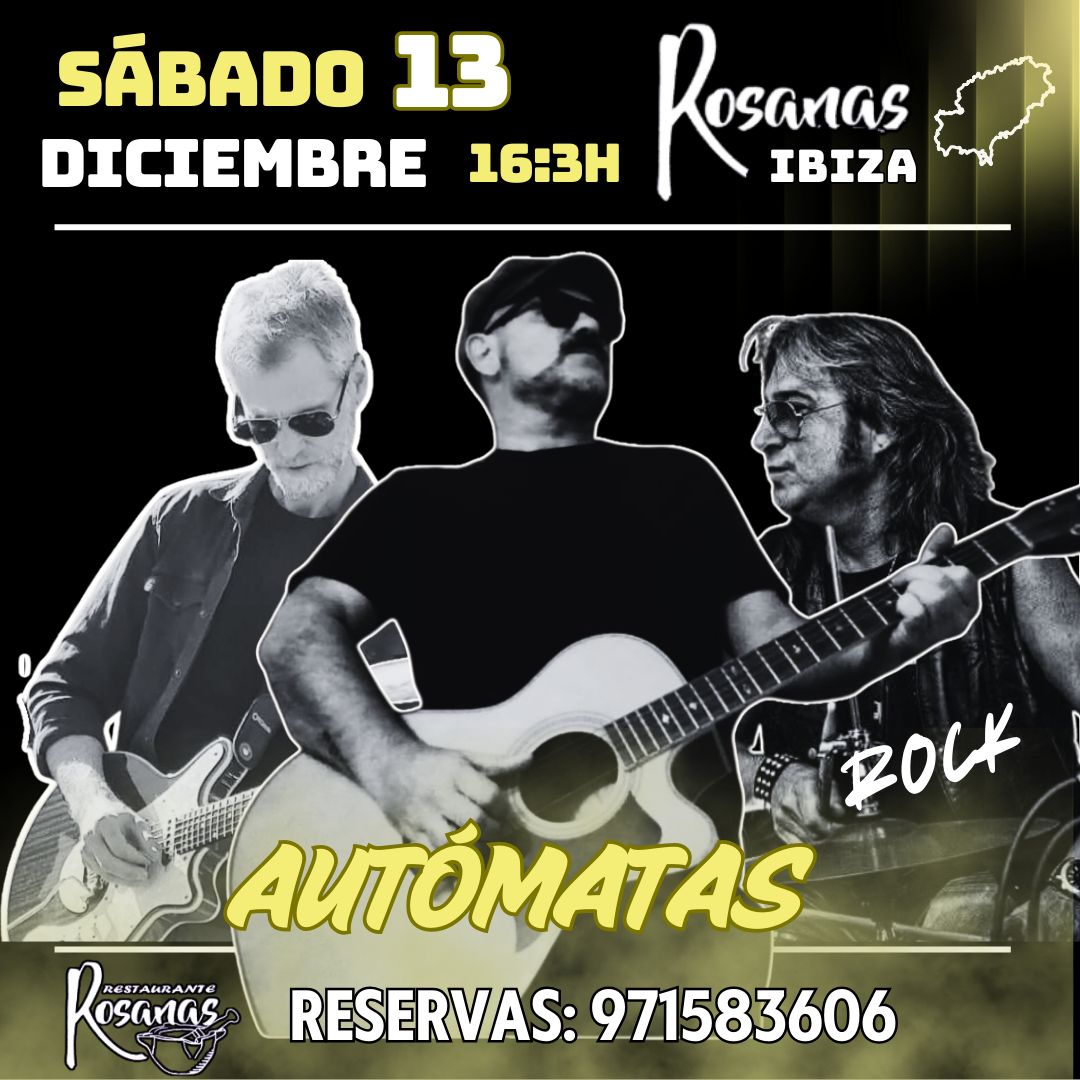 Els qui acudeixin aquest dissabte al restaurant Rosana’s, prop de Can Bellotera, tendran l’oportunitat de gaudir del grup Autómatas, format pels guitarristes Jordi Martínez i Mario Hosch, que oferiran un repertori de grans clàssics del rock. En aquesta ocasió, a més, els acompanyarà el bateria Rubén Griñant.