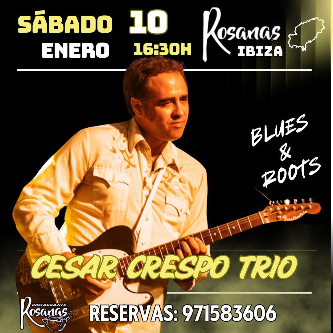 Després del concert de Can Jordi, el cantant i guitarrista madrileny de blues César Crespo també protagonitza el concert del dissabte al bar restaurant Rosana’s. Arriba en format trio, acompanyat pel baixista argentí Christian Morana i el bateria asturià establert a Eivissa David Barona.