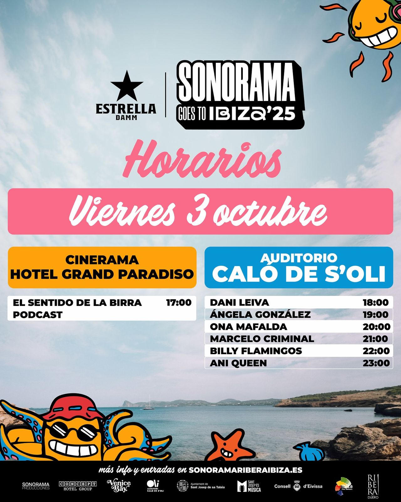 El recinte Venice Bay, de Concept Hotel Group, i la zona exterior de l’Auditori Calo de s’Oli acullen el 3 i 4 d’octubre la V edició del Festival Sonorama Ribera Goes to Ibiza, que comptarà amb la participació d’un total de 15 grups de tot el país i algunes activitats paral·leles. Aquesta primera jornada vespertina i gratuïta es celebra al recinte exterior de l’Auditori Caló de s’Oli amb les actuacions de Dani Leiva (18 hores), Ángela González (19 h.), Ona Mafalda (20 h.), Marcelo Criminal (21 h.), Billy Flamingos (22 h.) i Ani Queen (23 h.).