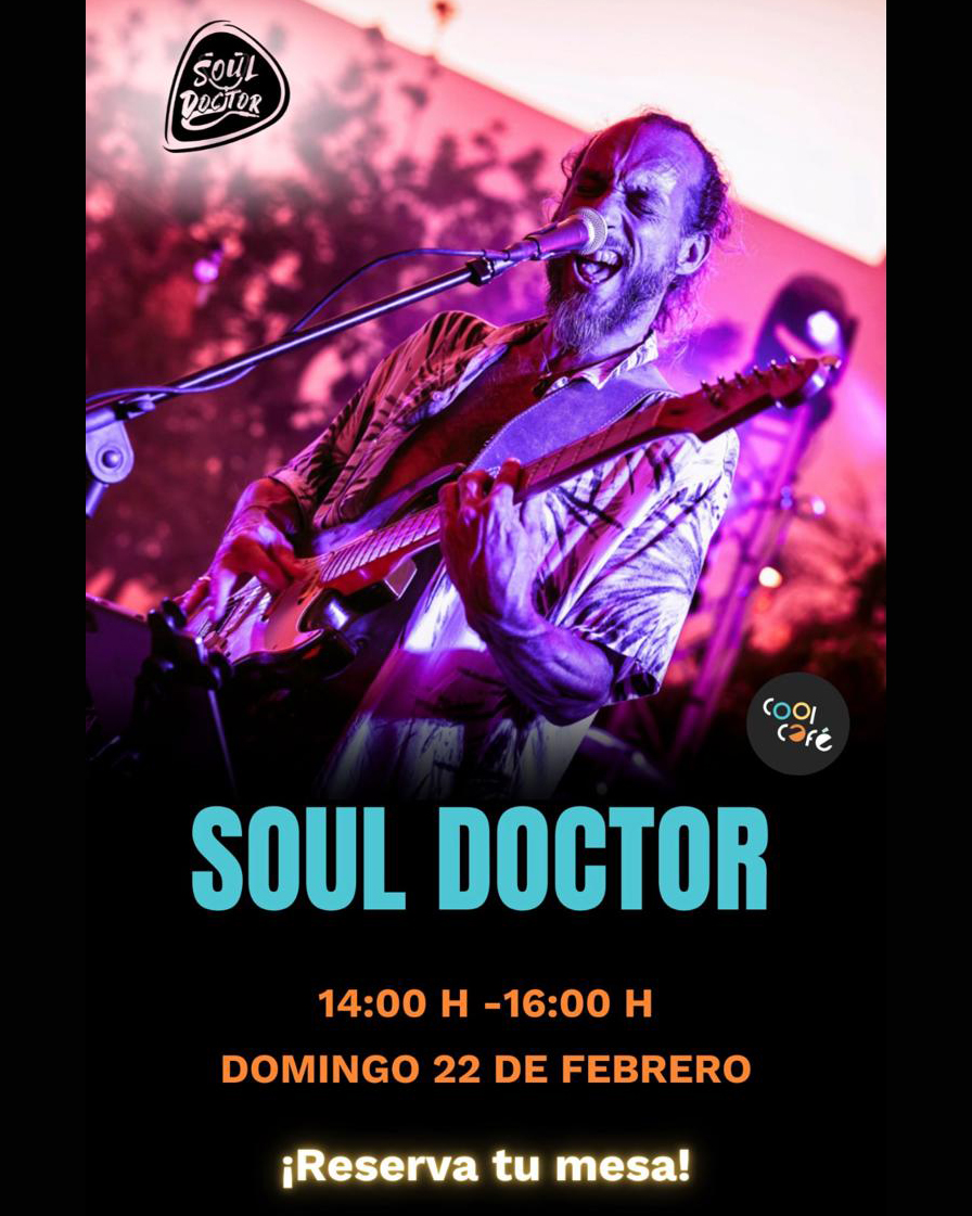 Tots els diumenges el públic que acudeix al restaurant Cool Cafè, a Cala de Bou, pot gaudir de les millors bandes d’Eivissa en viu. Aquesta vegada actua Soul Doctor, per a molts el més destacat grup de versions de l’illa, en format trio. El formen Matteo Crocetti (veu i guitarra), Gabriel de Miranda (baix) i Michael Alcaras (bateria). Tots ells són músics professionals de llarga trajectòria i ofereixen un repertori molt potent de temes de soul i funky, que impacten al públic per la qualitat interpretativa i el feeling que li posen tots els artistes.
