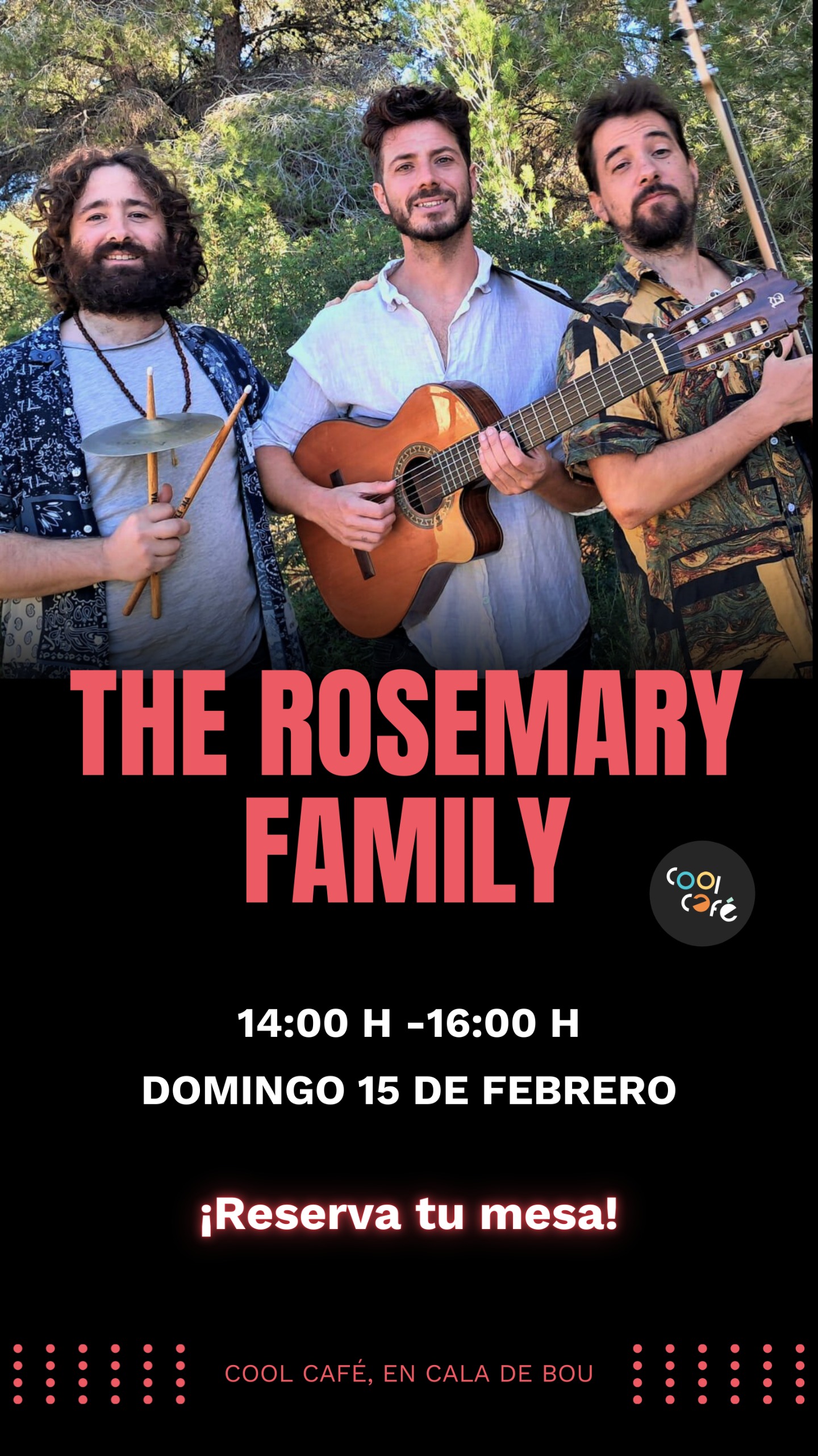 Tots els diumenges, a l’hora del dinar, el bar restaurant Cool Cafè ofereix un concert amb les millors bandes locals. En aquesta ocasió protagonitza el cartell The Rosemary Family, que actuarà en format trio, amb Mario Romero a la veu i a la guitarra, Alfonso Hernández Morillas al baix i Sam de Lara a la percussió. El grup es caracteritza per la fusió de flamenc amb altres gèneres musicals com el rock, el funk o la rumba, sempre amb el seu particular estil, que convida a la festa l i la diversió.