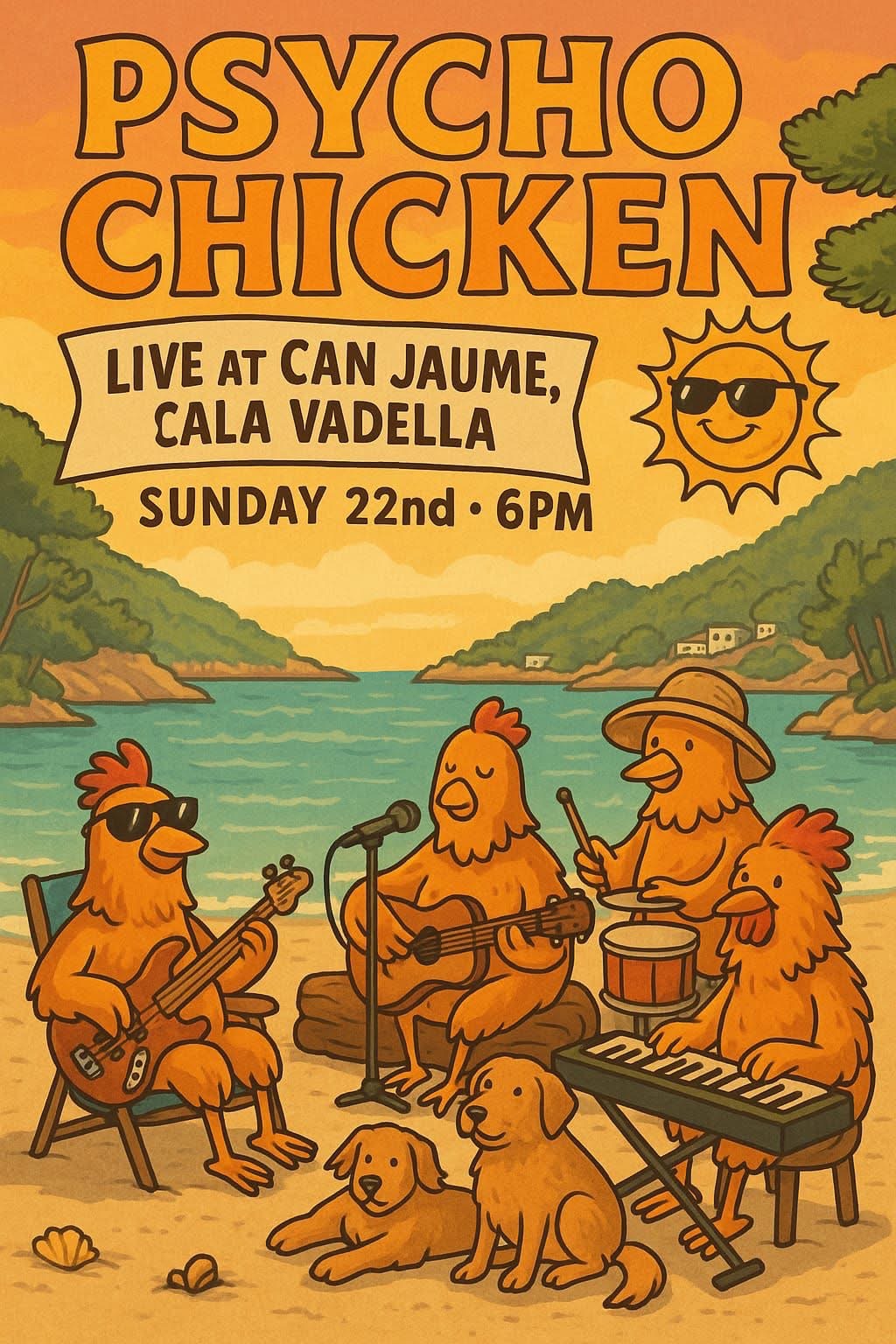 Sigueixen els concerts dominicals al bar restaurant Can Jaume, en plena riba de Cala Vedella. Aquesta vegada acudeix al seu escenari un nou grup anomenat Psycho Chicken. Es tracta d’una una banda de pop i rock and roll formada per quatre músics de llarga trajectòria i molt ofici. La componen el cantant i guitarrista irlandès Bill O’Brien, el seu fill i teclista Alex J. O’Brien, el baixista francès Patrick Levy i el bateria basc Aymar de la Sota. Ofereixen un ampli repertori de clàssics de la música contemporània dels anys 70 i 80, com The Beatles, Status Quo, Tears for Fears, The Who o Thin Lizzy, entre molts altres.