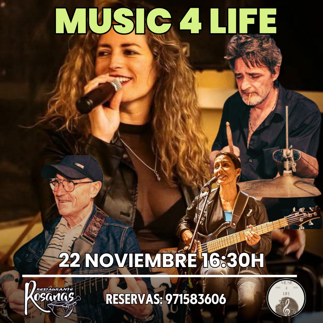 El bar restaurant Rosana’s, a la carretera Sant Josep-Eivissa, torna a oferir al públic una intensa sessió de pop, rock i soul amb el grup Music 4 Life. El formen Alejandra Rodríguez (veu), René Mercier (guitarra), Marcela Friederichs (baix) i David Adán (bateria). Porten un repertori de versions en castellà i anglès, d’artistes com The Beatles, Tina Turner, M Clan, Luz Casal o Estopa, entre molts altres.