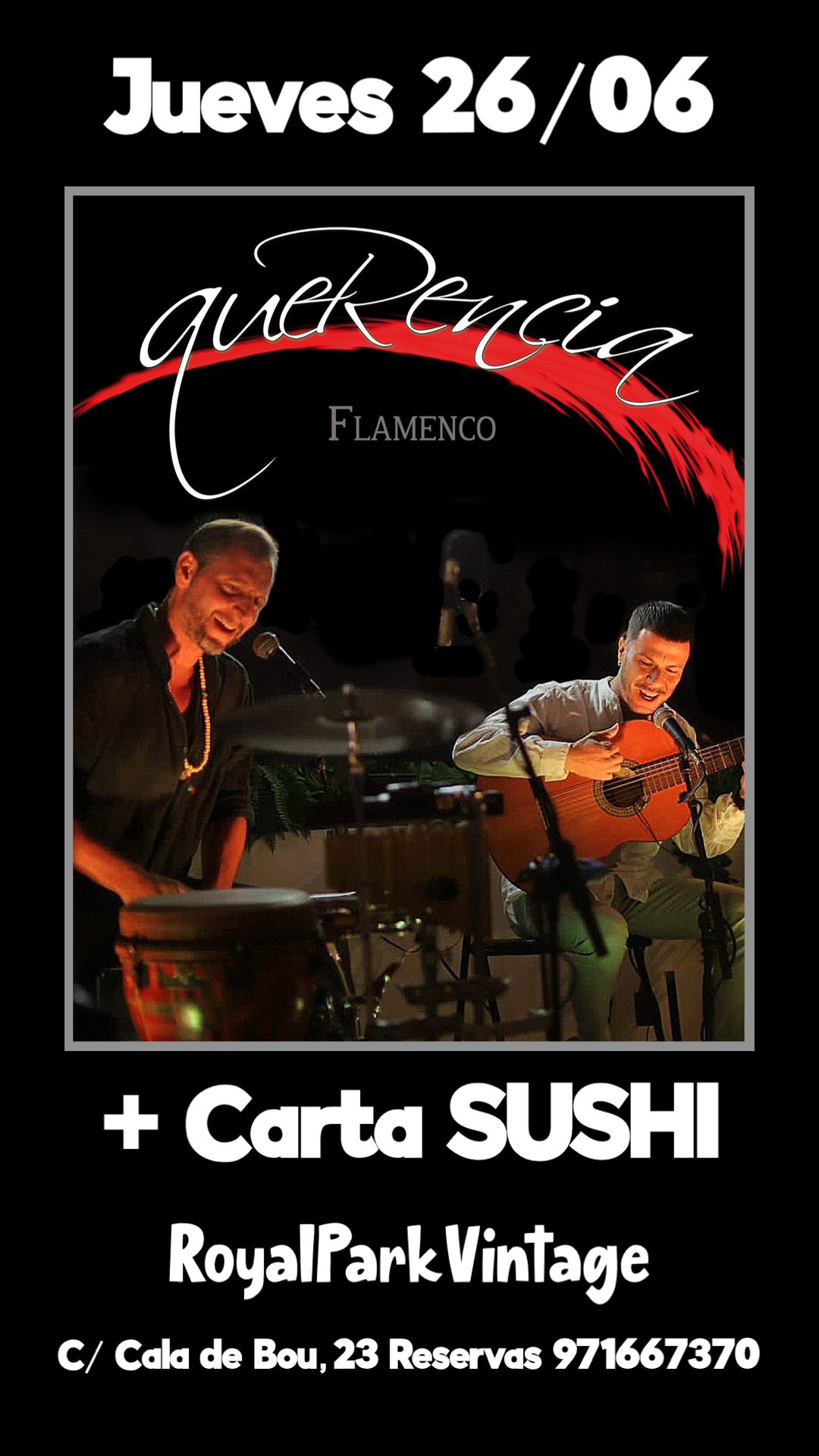El bar restaurant Royal Park Vintage, el popular mini golf de Cala de Bou, ofereix durant l’estiu un ampli programa de concerts, amb les millors bandes locals. En aquesta ocasió dedica la nit dijous al flamenc, amb l’actuació del grup Querencia, que oferirà un espectacle musical a trio, amb grans temes del gènere i algunes pinzellades de jazz i ritmes afrocubans. Aquesta formació va néixer l’any 2007, impulsada pel prestigiós percussionista Luis de las Heras.