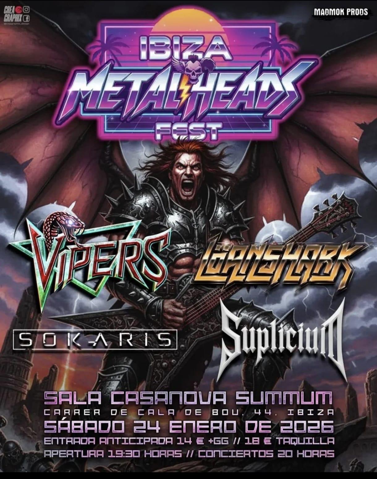 La sala de festes Summum Casanova, a Cala de Bou, acull un nou festival de rock dur amb quatre potents bandes. Es diu Ibiza Metal Heads Fest i participen els grups eivissencs Vipers, Sokaris i Suplicium, debutant aquesta última en els escenaris. També actuarà la formació de Barcelona Löanshark. Les entrades en taquilla costen 18 euros i si s’adquireixen de forma anticipada, 14.