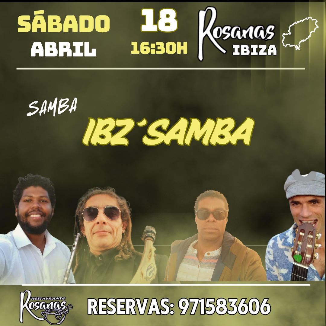 Els concerts del dissabte a Rosana’s sempre atreuen a una multitud de públic. En aquesta ocasió, el cartell el protagonitza IBZ Samba, un quartet dedicat a la música brasilera, que torna a actuar després d’uns anys de parèntesis. Està format per músics de l’illa especialitzats en ritmes brasileros i interpreten els principals clàssics del país, en la versió més tradicional, de gèneres com la samba, la bossa nova i el forró, entre altres. El componen Carlos Lisboa a la percussió, Víctor Ávila al saxo, Eduardo Egito a la guitarra i la veu i Gui Oliveira al baix.