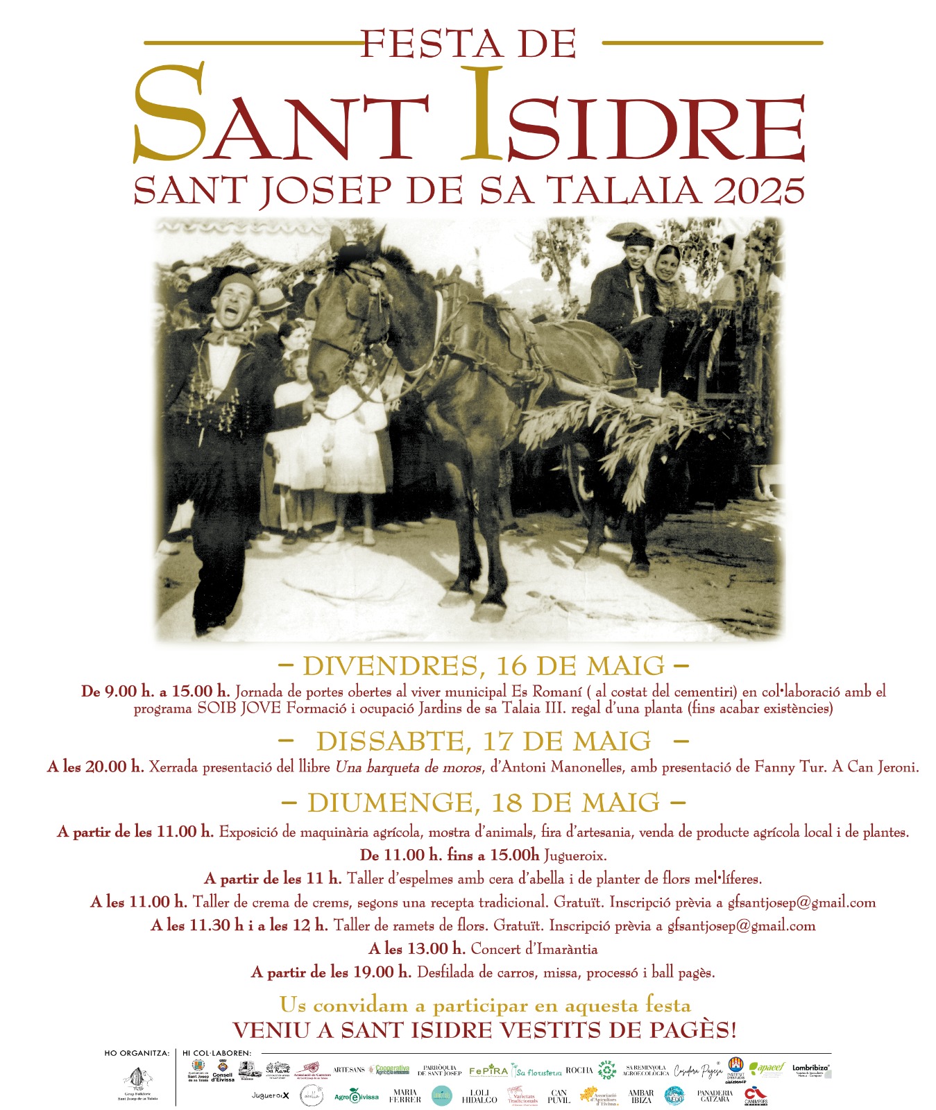 La fiesta de San Isidro en Sant Josep celebra su XXVI edición e incluirá otras muchas actividades en la zona peatonal del Ayuntamiento. Desde las 11 horas habrá una exposición de maquinaria agrícola, muestra de animales, feria de artesanía y venta de productos agrícolas y plantas.
