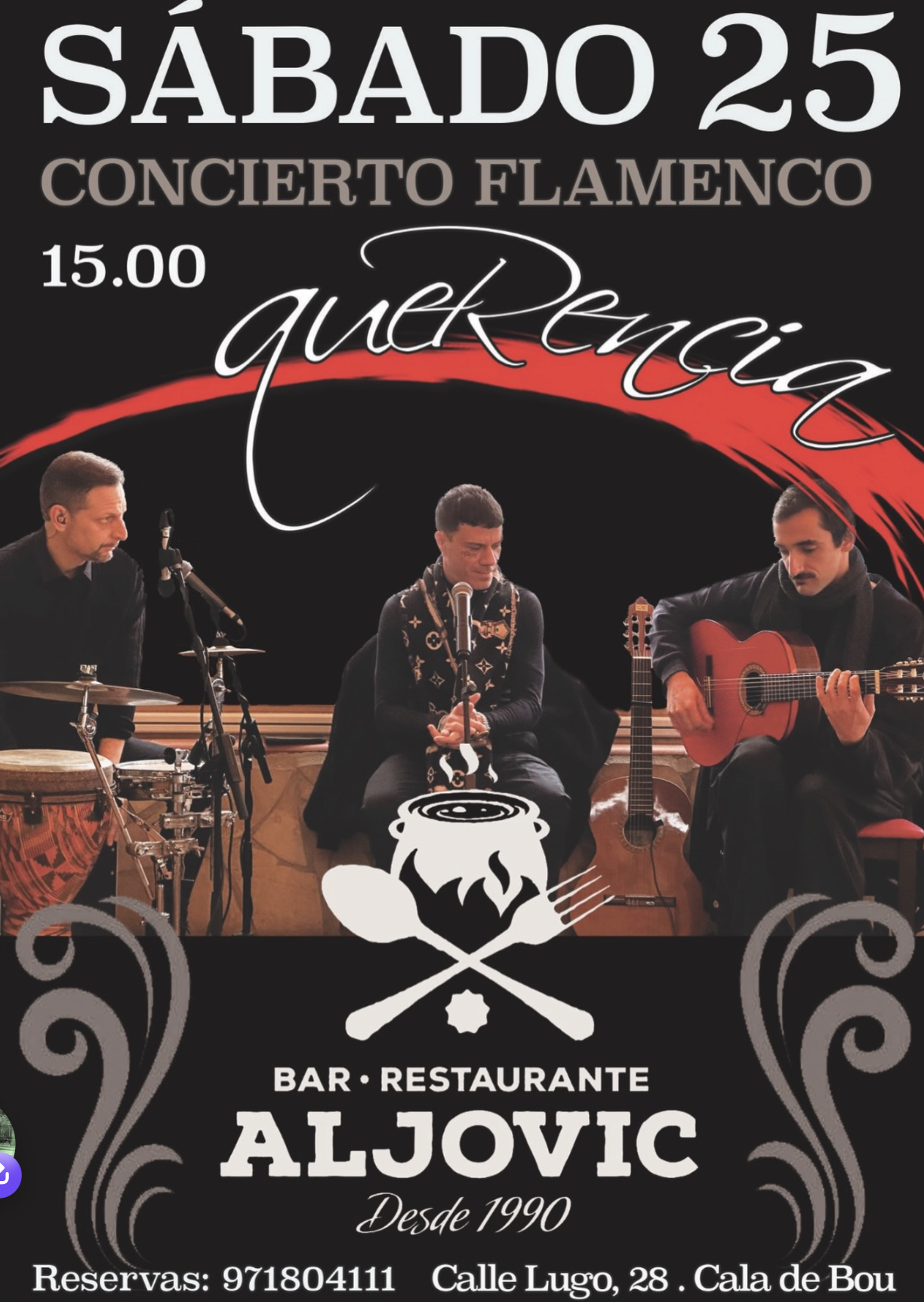 El popular bar restaurante Aljovic, frecuentado por multitud de vecinos de Cala de Bou, se suma este sábado a la música en vivo, con un partel protagonizado por el grupo Querencia, que ofrecerá su magnífico espectáculo de flamenco. Esta formación nació en el año 2007, impulsada por el percusionista Luis de las Heras. Ofrece un repertorio musical elegante, manteniendo siempre las raíces flamencas y con algunas pinceladas de fusión latina.