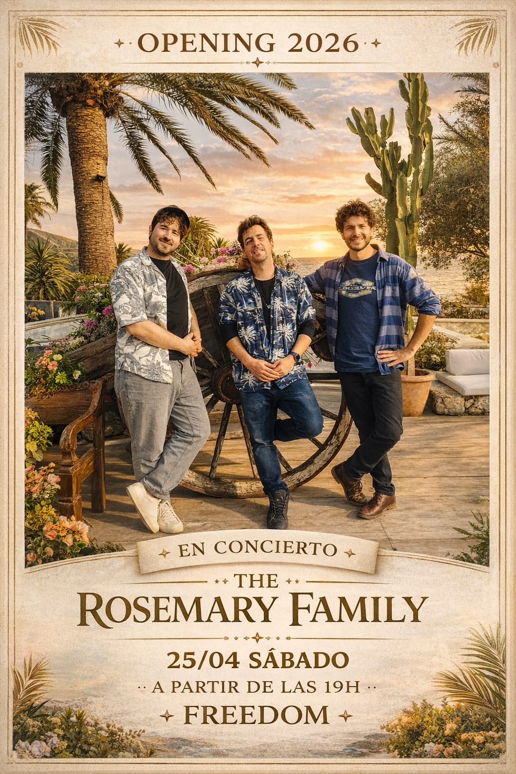 Freedom es un singular chiringuito a pie de playa, situado en es Pinet, en la zona de Cala de Bou. Como es habitual, arranca la temporada con un concierto para bailar sobre la arena, a cargo de The Rosemary Family. Actúan en formato trío, con Mario Romero a la guitarra y la voz, Fonsi Hernández al bajo y Sam de Lara a la percusión. Ofrecen un repertorio de versiones de rumba, flamenco, funky…