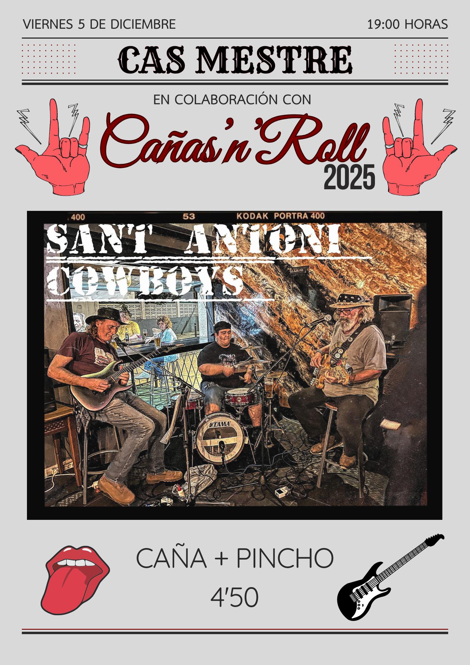 Cas Mestre también se ha sumado al certamen musical y gastronómico Cañas’n’Roll, con un par de conciertos. El primero tiene como protagonista a la banda Sant Antoni Cowboyz. Actualmente la forman Andy Holdstock (voz y guitarra), Thom Vos (bajo) y Pep Marí (batería). Andy y Thom también pertenecen al grupo Fuel Pressure Regulator y a Pep Marí lo hemos visto tocar con Storm Riders y más recientemente como parte del grupo Los III Amigos, de Chris Langley. Ofrecen versiones de clásicos del rock de todo el siglo XX.