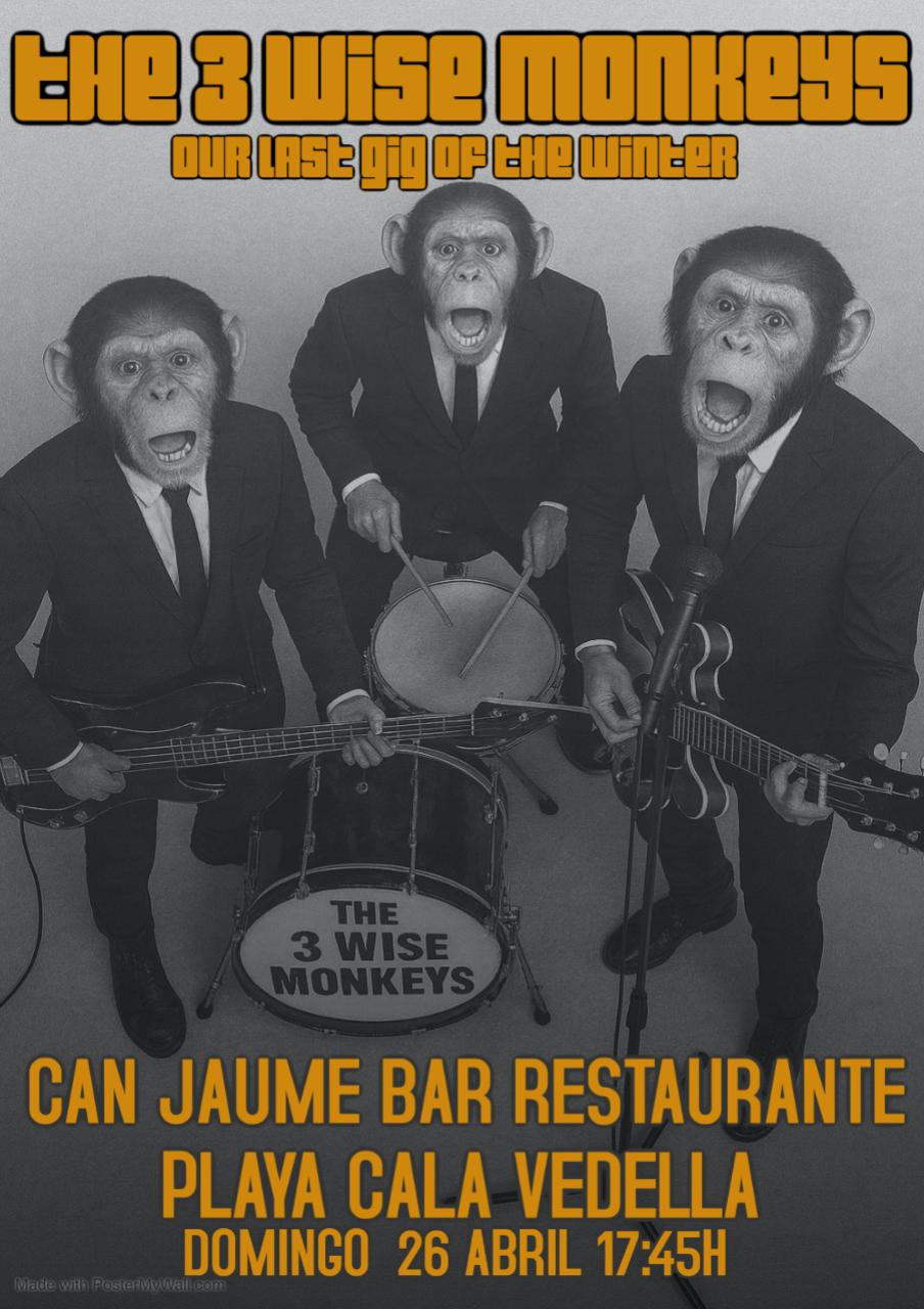 The 3 Wise Monkeys, la banda de Stephen La Porte (voz y guitarra), Patrick Levy (bajo) y Aymar de la Sota (batería), vuelven a ser los elegidos para el habitual concierto dominical que ofrece el restaurante Can Jaume, en la orilla de Cala Vedella, que ya ha comenzado la temporada. Ofrecerán versiones de canciones de The Beatles, The Rollings Stones, The Police, The Clash, The Jam, Elvis Presley y otras formaciones históricas. Es el último concierto que ofrecen en el establecimiento antes de comenzar la temporada de verano en los hoteles.