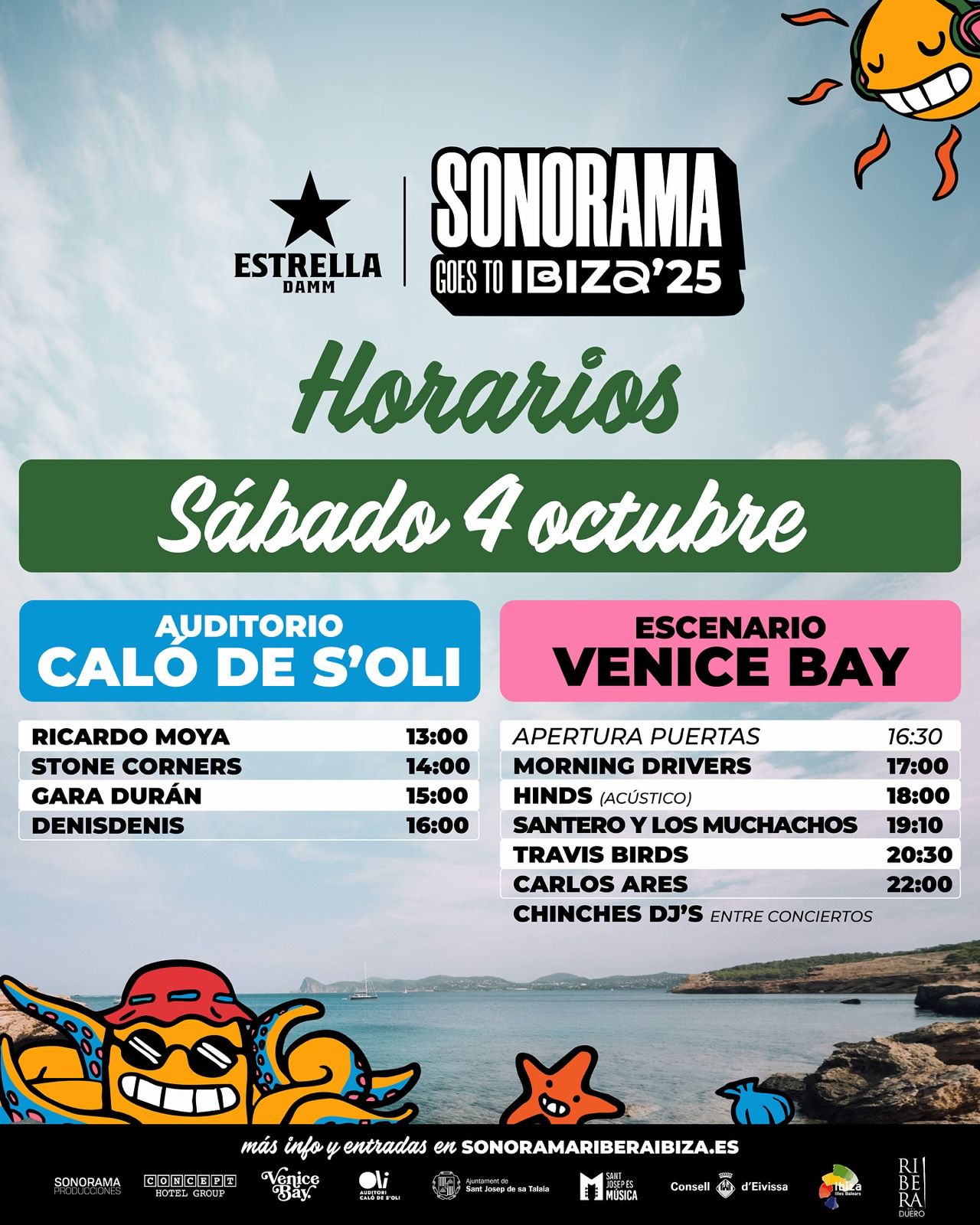El recinto Venice Bay, de Concept Hotel Group, y la zona exterior del Auditorio Caló de s’Oli acogen el 3 y 4 de octubre la V edición del Festival Sonorama Ribera Goes to Ibiza, que contará con la participación de un total de 15 grupos de todo el país y algunas actividades paralelas. Esta segunda jornada gratuita se celebra en el recinto exterior del Auditorio Caló de s’Oli con las actuaciones de Ricardo Moya (13 horas), Stone Corners (14 h.), Gara Durán (15 h.) y Denisdenis (16 h.).