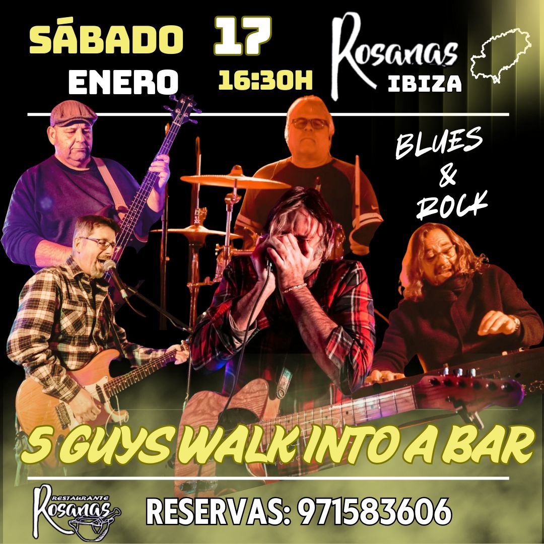 El bar restaurante Rosana’s ofrece un concierto todos los sábados por la tarde. En esta ocasión protagoniza el cartel la potente banda de blues y folk americano Five Guys Walk Into A Bar. Ellos son Soulman Sal (voz y guitarra), Ferran Nogués (voz y guitarra), Cristian Krivoruchko (órgano Hammond), Francis Fastfingers (bajo) y Jordi Juan (batería). Esta formación ofrece un amplio repertorio de temas de blues clásico, algo de folk americano y música de Nueva Orleans. Entre sus artistas de cabecera, Robert Johnson, Bob Dylan, Tab Benoit, Elmore James, B. B. King, Muddy Waters, Mississipi Fred McDowell, Hank Williams, Sam Cooke, Albert Collins, Freddie King, Ray Charles o Jimbo Mathus.