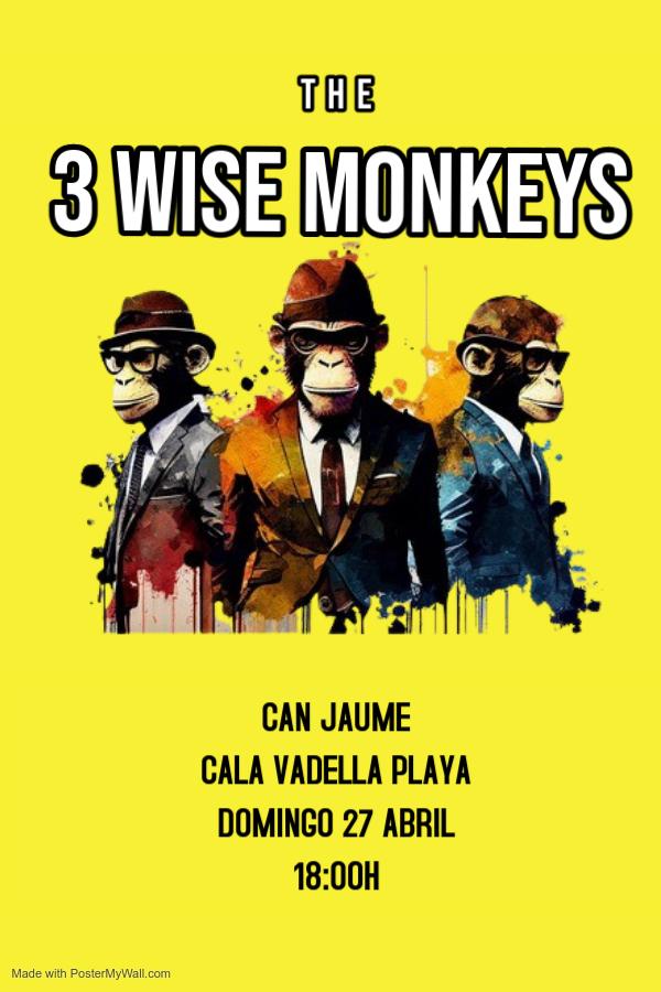The 3 Wise Monkeys, la banda de Steve (voz y guitarra), Pat (bajo) y Aymar (batería), vuelve al bar restaurante Can Jaume, en la orilla de Cala Vedella, para protagonizar el concierto vespertino del domingo. Traen un potente repertorio de versiones con temas de The Beatles, The Rollings Stones, The Police, The Clash, The Jam, Elvis Presley y otras formaciones históricas.