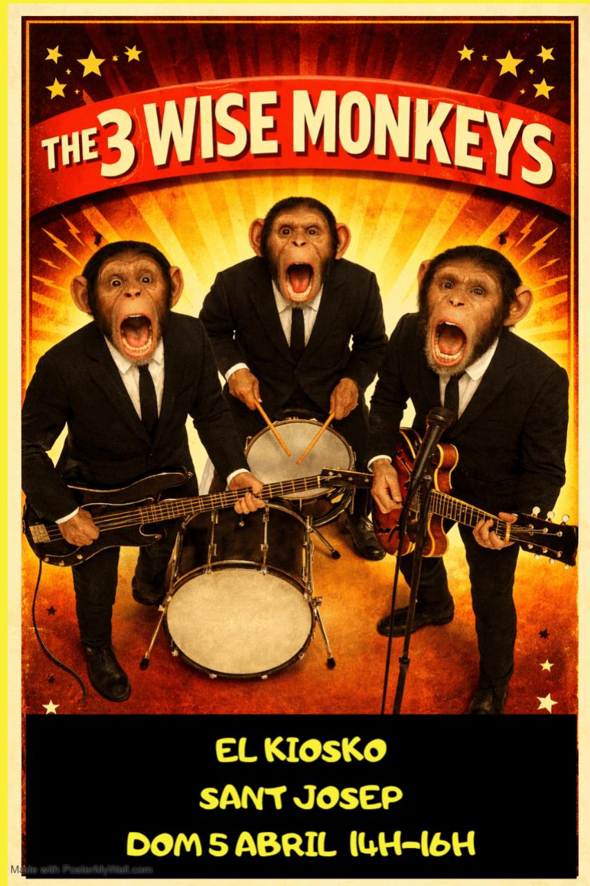 La terraza de El Kiosko, en Cala de Bou, es una de las más concurridas de todo el barrio y ofrece un magnífico calendario de conciertos tanto al principio como al final de la temporada. En esta ocasión el cartel lo protagoniza una de las mejores bandas de rock de la isla: The 3 Wise Monkeys, formada por Stephen La Porte (voz y guitarra), Patrick Levy (bajo) y Aymar de la Sota (batería). Traen un potente repertorio de versiones con temas de The Beatles, The Rollings Stones, The Police, The Clash, The Jam, Elvis Presley y otras formaciones históricas.