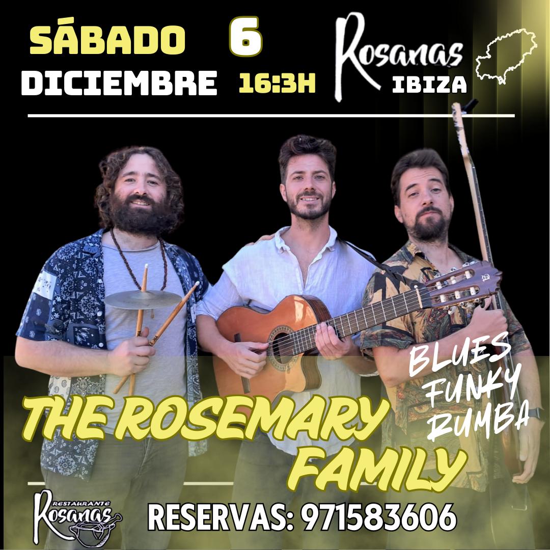 Todos los sábados por la tarde hay concierto en el bar restaurante Rosana’s, con bandas locales que ofrecen múltiples géneros musicales. En esta ocasión el público podrá disfrutar nuevamente con el grupo The Rosemary Family en formato trío, con Mario Romero a la voz y a la guitarra, Alfonso Hernández Morillas al bajo eléctrico y Sam de Lara a la percusión. Ofrecen un repertorio de rumba, funky, pop y otros géneros.