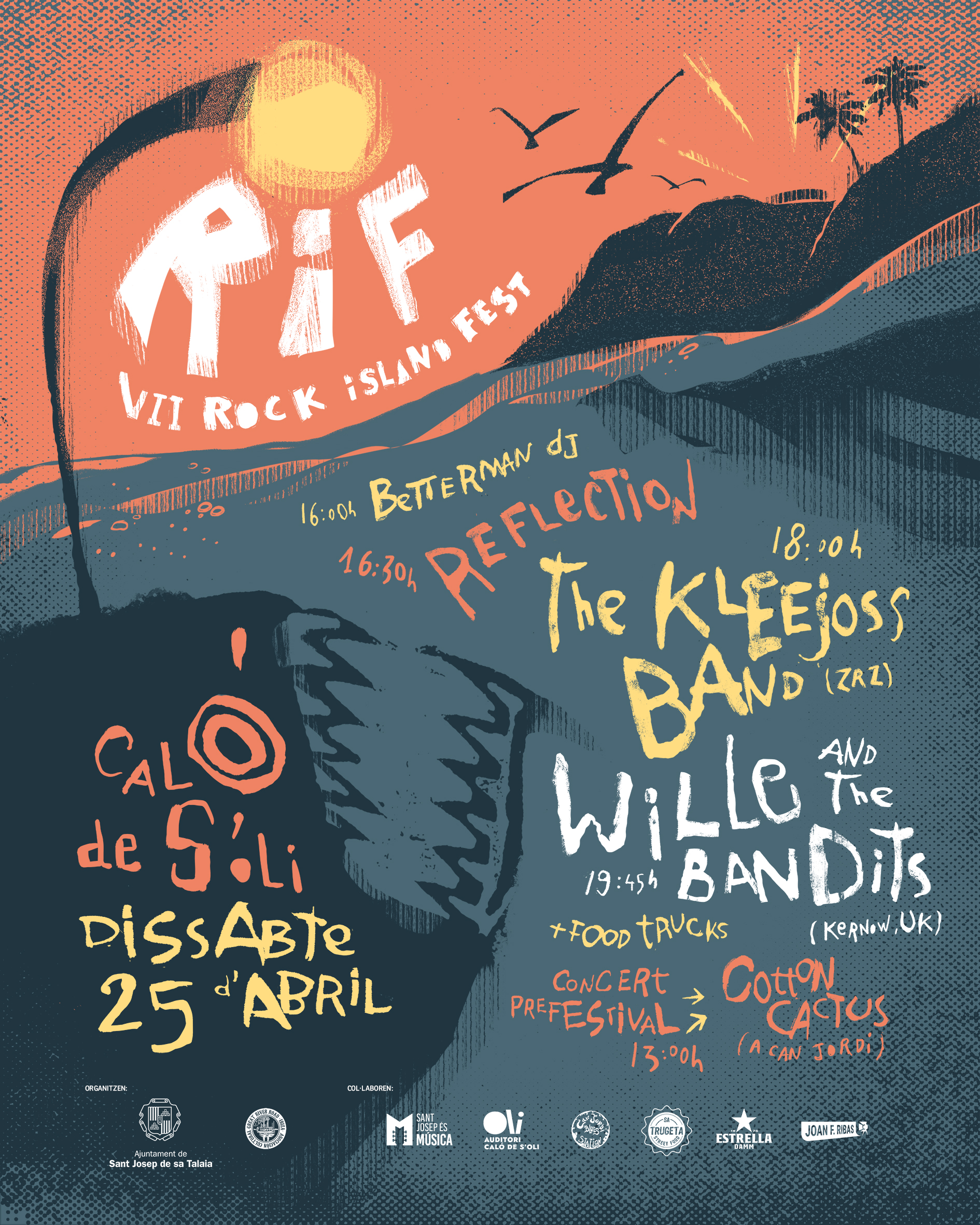 Sant Josep acoge el sábado 25 de abril uno de los eventos imprescindibles y más emocionantes de la primavera: la VII edición del Rock Island Festival, que como ya es tradición volverá a celebrarse en el recinto exterior del Auditorio Caló de s’Oli. El festival se abre por primera vez al rock internacional, al traer a la prestigiosa banda británica Wille and The Bandits, a los que se suma el conocido grupo zaragozano The Kleejoss Band y la banda local de folk rock Reflection. Tras la gran experiencia del año pasado, el festival ha organizado un preconcierto en Can Jordi Blues Station con la banda local Cotton Cactus, que comenzará a las 13 horas.
