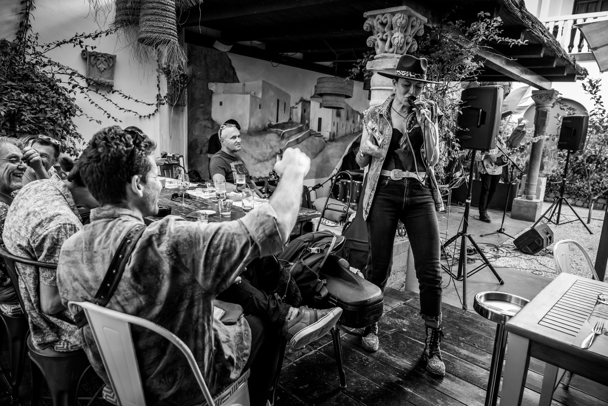 Restaurante de carnes a la brasa con una extensa terraza donde se celebran conciertos en las veladas del fin de semana, cuando llega el buen tiempo