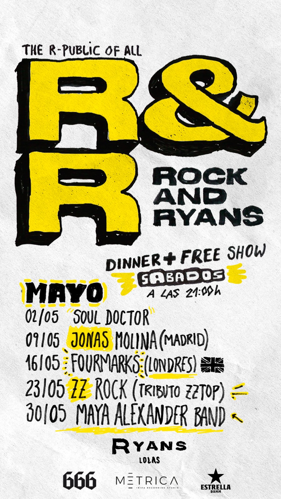 El Hotel Ryans Lolas, en colaboración con el músico y promotor Javier Salamanca, Estrella Damm y el estudio Métrica, inicia en mayo Rock & Ryans, un ambicioso programa de música en vivo que compaginará actuaciones de bandas locales con otras de formaciones inglesas, una vez al mes. Los conciertos se desarrollarán en el famoso restaurante de hamburguesas premium 666, situado en este establecimiento hotelero (Carrer de Cantàbria, 14, en Cala de Bou), y el acuerdo también incluye que bandas ibicencas puedan actuar en dos establecimientos situados en el barrio londinense de Camden Town, conocido por su atmósfera alternativa, vibrante y rockera.
