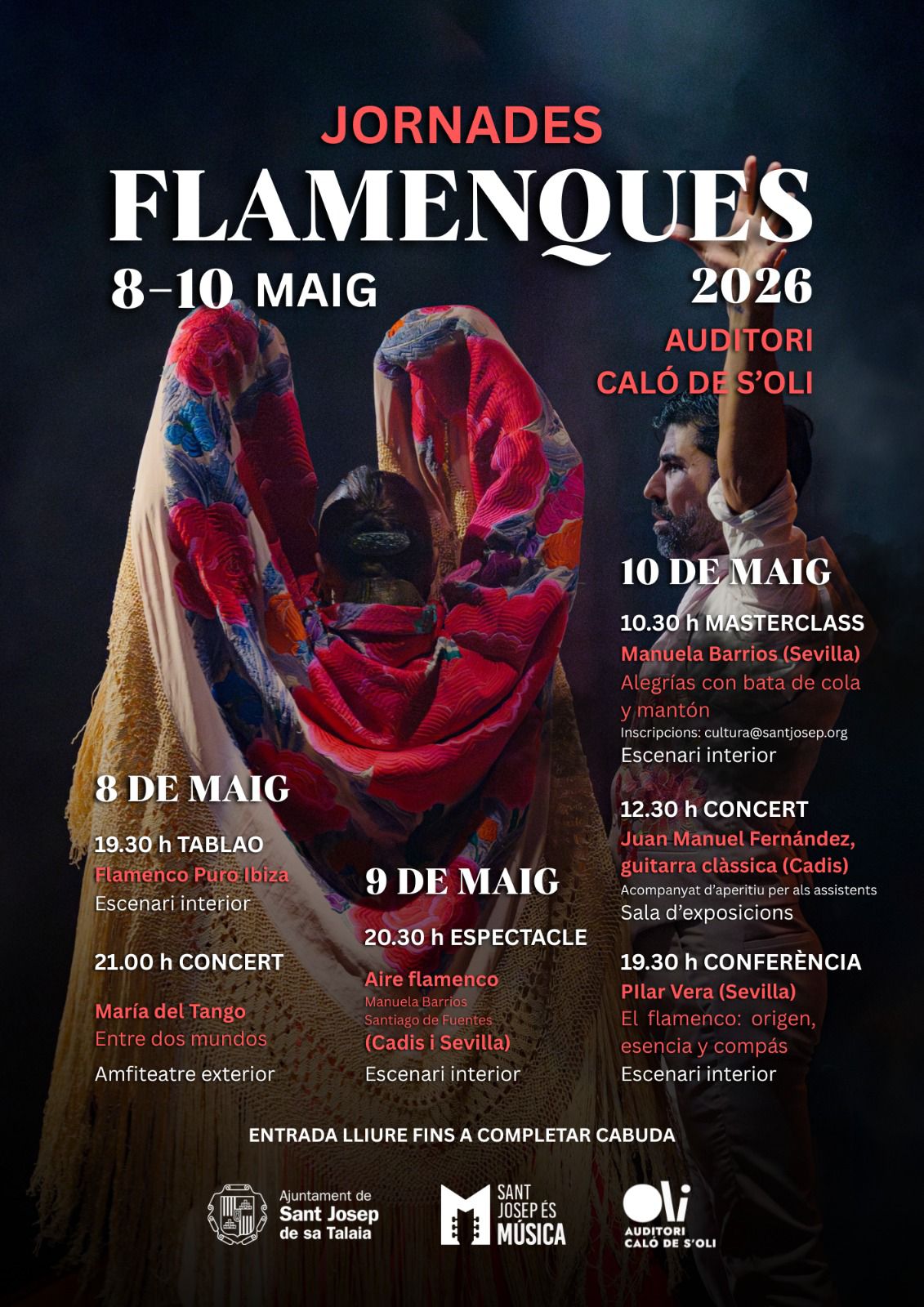 L’Ajuntament de Sant Josep de sa Talaia ha presentat aquest matí la cinquena edició de les Jornades Flamenques, que es celebraran a l’Auditori Caló de s’Oli entre el 8 i el 10 de maig. Com és habitual, el programa inclou la participació de prestigiosos artistes del flamenc, com el ballador Santiago de Fuentes, la balladora Manuela Barrios, el cantaor Jesús Castilla o el guitarrista Juan Manuel Fernández, que es trobaran en l’espectacle Aire Flamenco al costat d’altres músics, oferint també masterclass i actuacions en solitari en alguns casos. A més, actuaran la granadina María del Tango, una de les veus més singulars del flamenc contemporani, que arriba amb tota la banda per a presentar nou àlbum, així com la formació Flamenco Puro Ibiza i la flamencóloga i cantaora sevillana Pilar Vera.